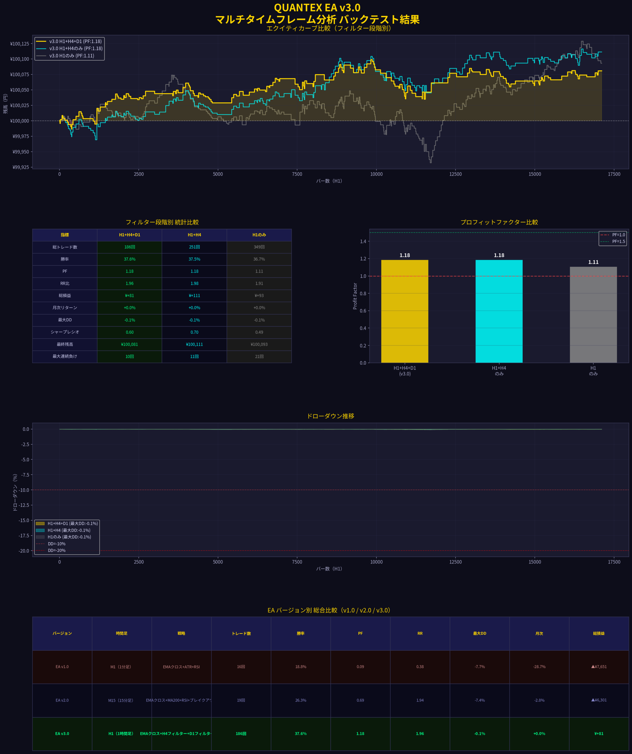v3.0とv2.0(M15)のバックテスト結果の比較です。フィルターを段階的に追加することで、PF(プロフィットファクター)が着実に改善されていることが確認できます。