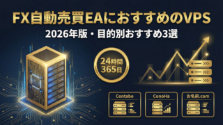 FX自動売買(EA) FX自動売買(EA)におすすめのVPSは?2026年版・目的別おすすめ3選 FX自動売買EAを24時間安定稼働させるためのVPS選びを解説。2026年版・目的別おすすめ3選(Contabo・ConoHa・お名前.com)を比較し、初心者でも失敗しない選び方を紹介します。 2026.03.20 FX自動売買(EA)